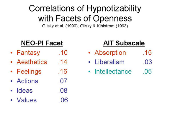 Glisky, M. L., & Kihlstrom, J. F. (1993). Hypnotizability and facets of openness. International Journal of Clinical & Experimental Hypnosis, 41(2), 112-123.