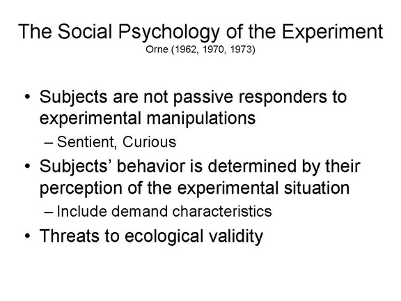 Orne, M. T. (1962). On the social psychology of the psychological experiment: With particular reference to demand characteristics and their implications. American Psychologist, 17, 776-783.
