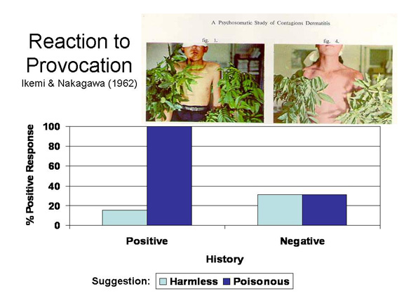 Here again, hypnosis reminds us that beliefs and ideas can, in fact, affect bodily functioning. Not just in terms of mental states, like pain, and correlated neural activity; but anatomy and physiology outside the nervous system. Consider, for example, the provocative study by Ikema and Nakagawa (Ikemi & Nakagawa, 1962), who gave subjects with a history of contact dermatitis suggestions that they were being stroked with an allergenic leaf from a lacquer tree (rhus venicifera) or wax tree (rhus succceedanea) similar to our poison oak or ivy, when in fact the leaf was from a harmless chestnut tree, or vice-versa. The results were quite startling: when it was suggested that the harmless plant was poisonous, they showed a positive allergic reaction; when it was suggested that the poisonous plant was harmless, the reaction was substantially reduced. At the risk of making even our pun-prone symposium chairman groan, we may say that it wasn't the leaf that caused the reaction; it was the be-lief.