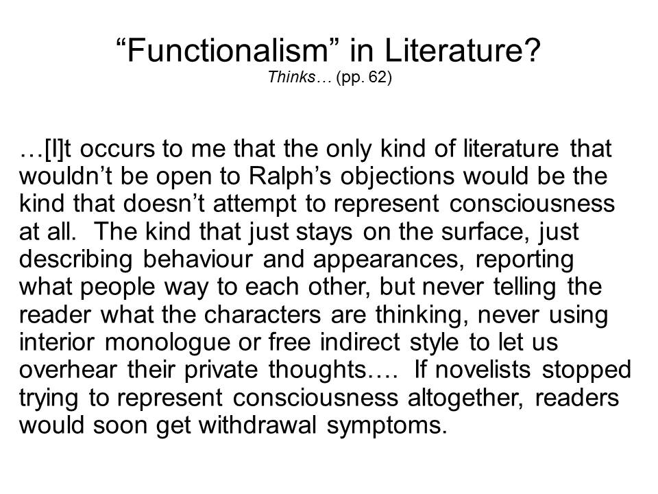 for her part, argues that novels actually constitute "thought experiments" in how to represent consciousness. And that without this representation of consciousness, novels wouldn't be novels, and wouldn't be satisfying for anyone to read. (In fact, her description of what a novel would be like without representations of consciousness closely resembles what some cognitive scientists call the "functionalist" approach to behavior -- descriptions that don't stray from "behaviour and appearances", without saying anything about the characters' inner lives.)