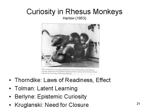 As with emotion, the cognitive revolution allowed psychologists to talk about motivation and other internal, mental states again -- even in nonhuman animals. There was, for example, a lot of talk about goals.But, as with emotion, cognition dominated psychological talk. To the extent that psychologists talked about motives at all, they tended to think of them, as in the Lepper experiment, as derived from cognition. We don't desire things, we just think we do.