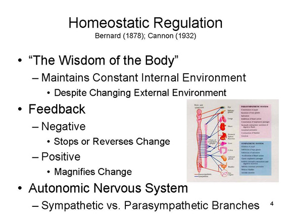 Many motivational processes are based on what the 19th-century French physiologist Claude Bernard called homeostatic regulation -- that is, the regulation of the organism's internal environment or physiological state. This is accomplished by a set of physiological mechanisms by which the body maintains a constant internal environment, despite changes in the external environment -- mechanisms that are so precisely tuned that Walter Cannon, an American physiologist, called them "the wisdom of the body" (1932).