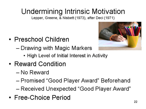 The Lepper study is a landmark in the cognitive-attributional interpretation of motivation. Just as Schachter and Singer (1962) did for emotion, the implication of the Lepper analysis is that motives are really merely beliefs about motivation -- beliefs that can be pushed around by situational manipulations. When no rewards are present, we believe that we want to do something. When rewards are present, we attribute the same behavior to the reward.