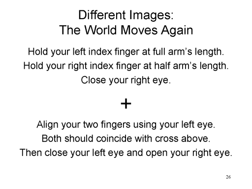 binocular disparity, hold out your left index finger at full