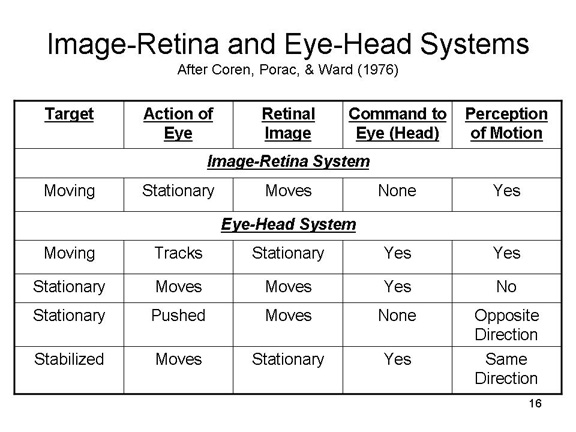 The effective stimulus for motion, then is the discrepancy between information provided by the image-retina and eye/head systems.