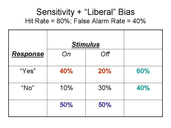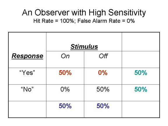 SDT also has a number of theoretical implications. In the first place, it denies that there is such a thing as absolute sensitivity. Sensitivity varies with expectations and motives. This undercuts the older view of the passive observer, as discussed in the lectures on learning: the stimulus is transduced by the receptor organ, transmitted through the nervous system, and -- provided it is intense enough -- detected by the observer. And it substitutes a view of the active observer: the stimulus is transduced and transmitted as before, but the observer must make a judgment about the stimulus: whether it is present, or whether it has changed. These decisions are influenced by the person's goals and expectations.