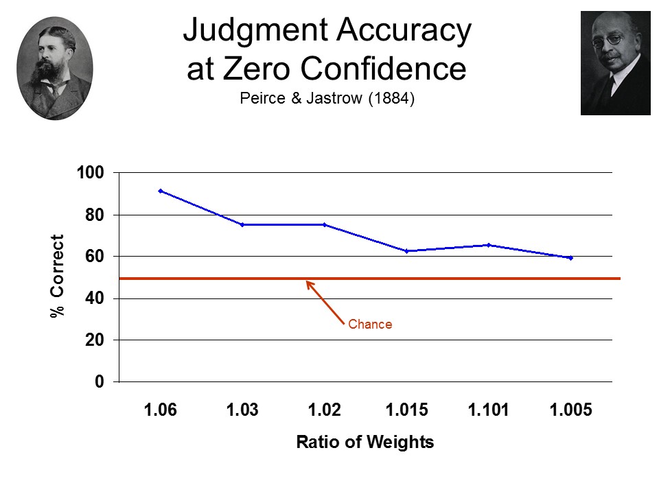 Here's an instance of the value of statistical analysis. We could debate all day whether a 60% hit rate was larger than the 50% hit rate expected by chance. But Peirce and Jastrow actually devised new statistical techniques to demonstrate that this difference was, indeed, statistically significant.