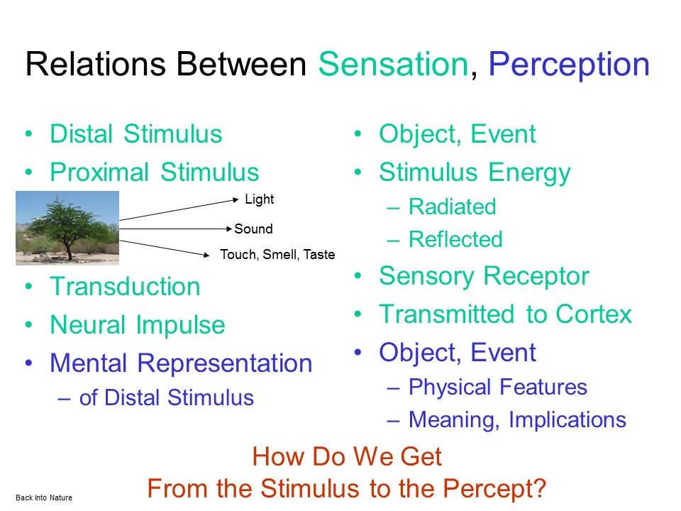 In sensation, we must first distinguish between the distal stimulus and the proximal stimulus.