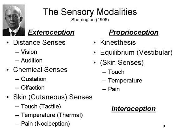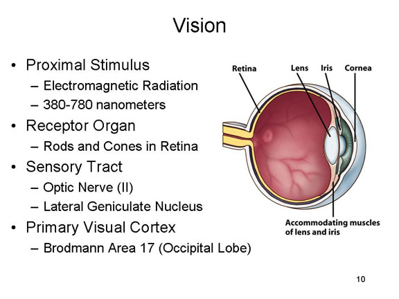 The first step in sensation is transduction, or the conversion of the proximal stimulus (light waves, sound waves, or whatever) into a neural impulse. This is accomplished by the sensory receptor organ. There are many different receptor organs in the body, roughly corresponding to the various modalities of sensation -- vision, audition, etc.