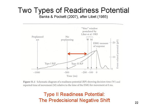 Libet's observation of a predecisional negative shift has been replicated in other laboratories, but that does not mean that his experiment is immune to criticism and his conclusions are correct (for extended discussions of Libet's work, including replies and rejoinders, see (Banks & Pockett, 2007; Libet, 1985, 2002, 2006). In the first place, there's a lot of variability around those means, and the time intervals are such that that the gap between the predecisional negative shift and the readiness potential could be closer to zero. And there are lot of sources of error, including error in determining the onset of the readiness potential, and error in determining the onset of the conscious wish (as for the latter, think about keeping track of a light that is rotating around a clockface once ever 2.5 seconds). Still, that difference is unlikely to be exactly zero, and so the problem doesn't go away.