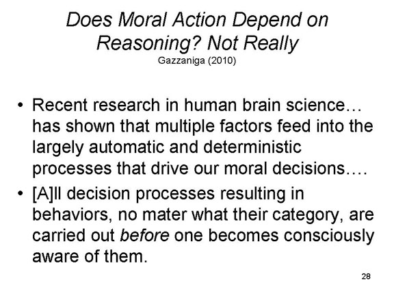 Moral intuitionism represents a fusion of automaticity and emotion, and like the literature that comprises the "automaticity juggernaut" (Kihlstrom, 2008) it relies mostly on demonstration experiments that reveal that gut feelings can play a role in moral judgments. There is no reason to generalize their findings to what people do in the ordinary course of everyday living. As I wrote in the Templeton essay (pp. 37-38):