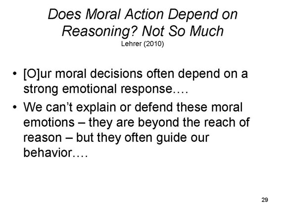 Even more to the point is a series of essays commissioned by the John Templeton Foundation in the spring of 2010, as part of its "Big Questions" series. These essays got almost no attention in the professional media -- neither the APA Monitor nor the APS Observer covered them -- despite the fact that this was the first time a Big Question targeted psychology. The Big Question was: "Does moral action depend on reasoning?" Among other authorities, five psychologists were asked to respond, and four of them said, essentially, "No".