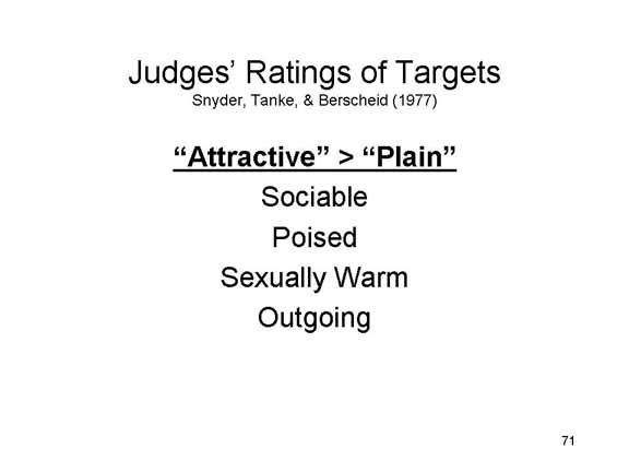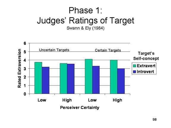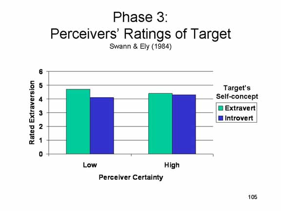 A footnote: It's fairly clear that the experiment didn't turn out quite as intended. It's essentially a standard 2x2 design, with high or low levels of perceiver certainty crossed with high or low levels of target self-certainty. The experimenters almost certainly wanted to see expectancy confirmation in at least one cell -- where the perceiver is highly certain about the target, but the target is relatively uncertain about herself. But they didn't really get this. Instead, the perceivers' expectancies got revised under all conditions of the experiment. And, I suspect, they also wanted the effects to be symmetrical: that the performance of introverts would mirror that of extraverts. They didn't really get this effect either -- perhaps because their sample of targets, being drawn from the population of college students, was somewhat biased toward extraversion in the first place. No matter: it's still a beautiful experiment.