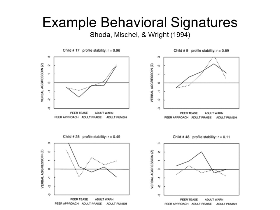 situation-behavior relations, or behavioral signatures, in turn, are mediated by what Mischel (e.g., Mischel & Shoda, 1995) calls the cognitive-affective