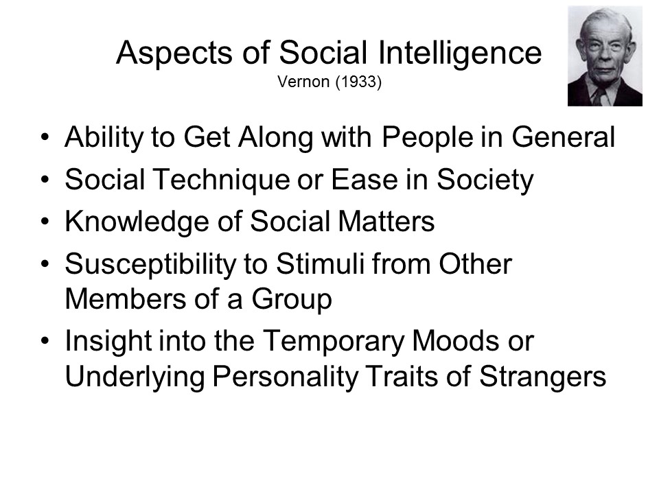 Thorndike's and Vernon's views exemplify what Kihlstrom and Cantor (2010) call the ability view of social intelligence -- that is, the view that social behavior can be classified as more or less "smart" or "stupid". In the ability view, what might be called "social IQ" is analogous to "academic" IQ, and consists of a number of abilities, or competencies, in which there are wide individual differences.