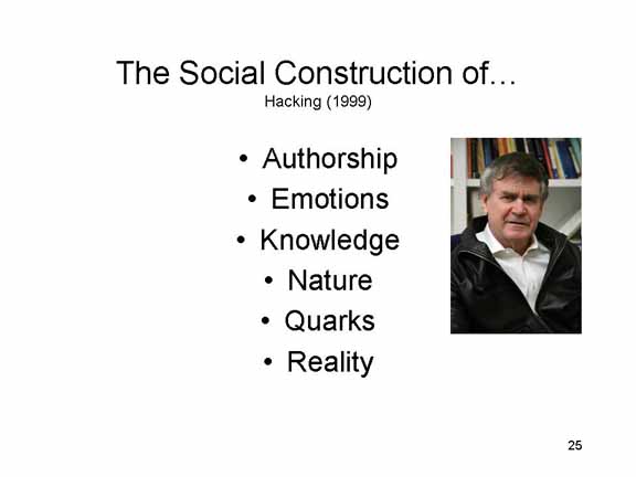 And, just to bring this all back to earth, social cognition tries to understand how people acquire, represent, transform, and use knowledge about the social world. But some of these social facts are themselves the product of individual mental activity -- they're not independent of the mind of the person who knows them. And some of these social facts are true only in certain social contexts -- because they are the product of the collective mental activity. Still and all, these facts are objectively true, even though they are observer-relative. In this sense, social reality is, at least in part, a social construction. In Hacking's terms, the challenge of social cognition is to understand things that are true, but which might be true only for those who think they are -- things that are true, but which might not be true for everyone, everywhere.