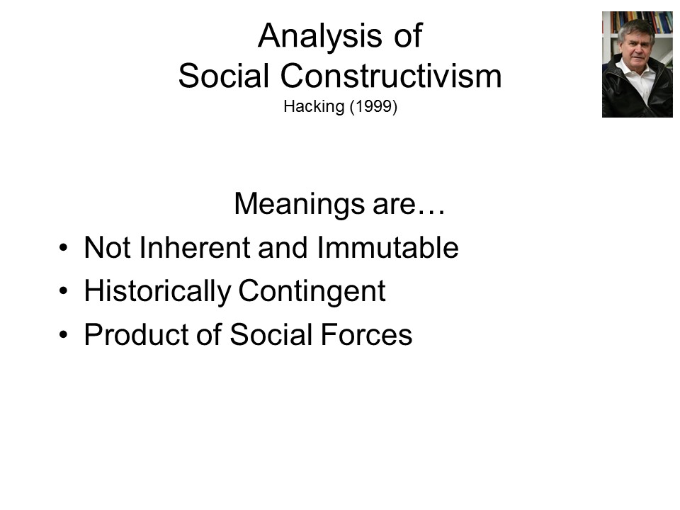 Hacking makes clear that there is a close connection between social constructivism and political ideology. But, as the George Bush example shows, the ideology is not necessarily of the left. And one doesn't have to be particularly political to take the idea of social constructivism seriously.