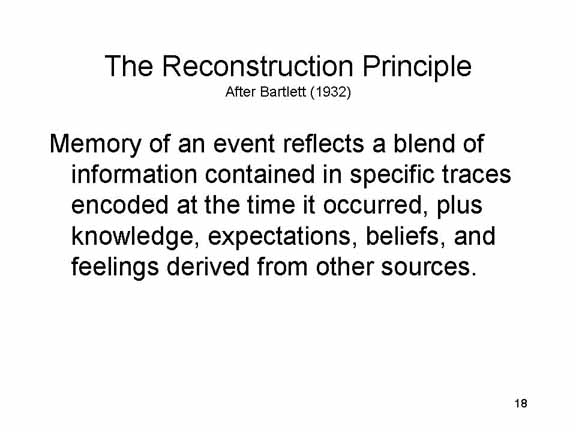 The point of all of this is that perception entails constructive activity on the part of the perceiver, and remembering entails reconstructive activity on the part of the rememberer. What we perceive are our constructions of the present; and what we remember are our reconstructions of the past.