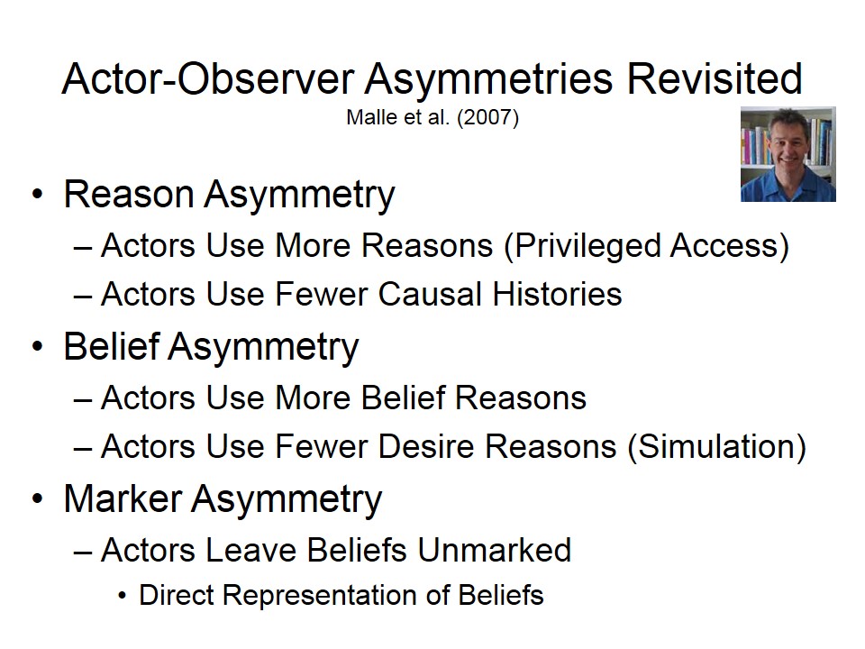 Heider further noted a general tendency for people to ascribe behavior to the actor. On the assumption that actors intend the outcomes of their actions, once an action has been categorized, the intention is given; and then the intention itself is derived from stable traits and other characteristics of the person.