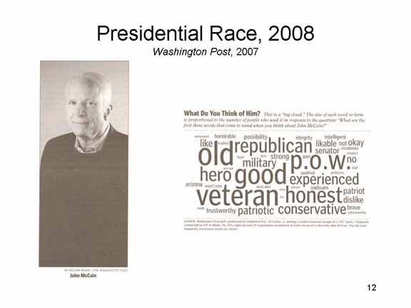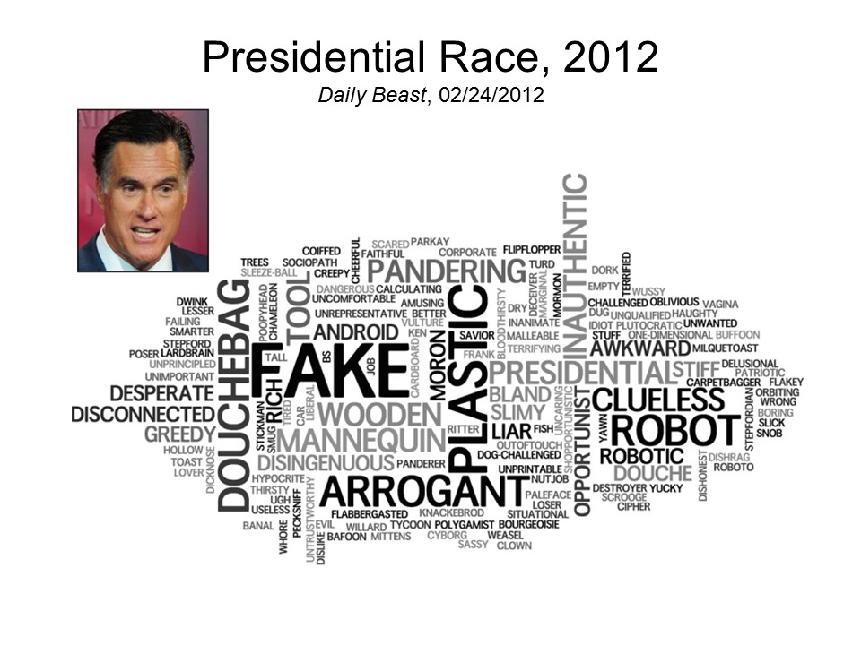 Our impressions of other people are typically represented linguistically, often as trait adjectives. Consider a survey by the Washington Post, which asked respondents to describe in three words the various candidates for the Democratic and Republican presidential nominations. The most frequent responses, arranged as "tag clouds" in which the font size represents the frequency with which the word was used, looked like these: