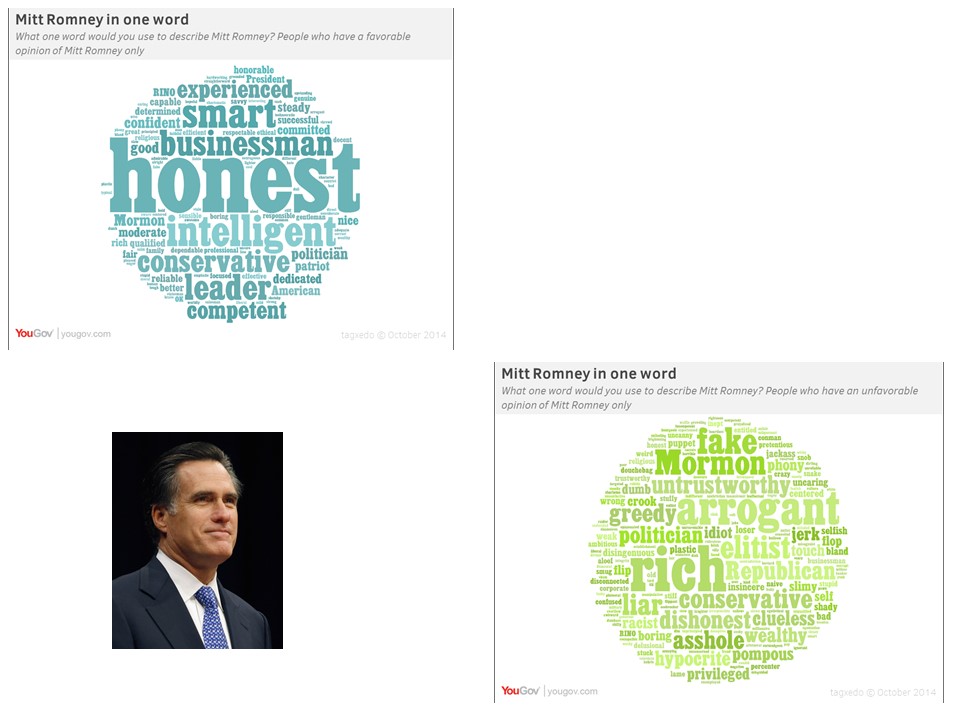 In 2015, in the run-up to the 2016 election, YouGov.com, a global online community that promotes citizen participation in government, conducted a similar survey in which visitors to the organization's website were asked to characterize some of the leading presidential candidates in one word (at the time, there was some indication that Mitt Romney would join the race). Separate word clouds were constructed from the responses of people who liked and disliked each candidate.