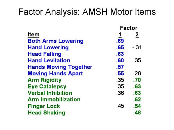 The Arizona Motor Scale consists of an induction of hypnosis (by eye closure) taken almost verbatim from the SHSS:C, followed by a series of representative hypnotic suggestions. Most of these suggestions were drawn from the Stanford or Harvard scales; others were devised anew, taking the established suggestions as models. Although the focus of Arizona Motor Scale was on direct and challenge suggestions, three items representing the cognitive factor (mosquito hallucination, posthypnotic suggestion, and posthypnotic amnesia) were also included in the scale, so that scores resembling those of the Harvard Group Scale:A or the Stanford Form A could be derived for purposes of selecting subject for other studies being conducted in the laboratory. Eliminating the first item (Eye Closure), which is administered during the induction procedure, and the three cognitive items, left a pool of six direct suggestions and six challenge suggestions for analysis.