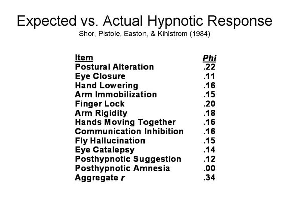 2In reporting some of the results of this research to you today, however, I want to make clear that we developed this new scale for specific research purposes, and we do not intend that it be substituted for the traditional measures like the Harvard and Stanford Scales. These instruments can use some tweaking around the edges, to take account of developments which have occurred in the 40 years since their introduction – in our lab, for example, we have modified their language a little bit, and added scales of subjective success and experienced involuntariness to the Harvard Scale. But still and all, the Stanford and Harvard scales put the study and application of hypnosis on a firm empirical base, and made it possible for one laboratory to attempt to replicate the work of another. This would not be possible if every laboratory used its own idiosyncratic measure of hypnotizability. The Stanford and Harvard scales have become institutionalized, now, and the costs of abandoning them at this point strike me as just too high. Return to text.