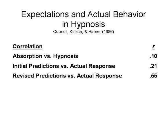 Council, J. R., Kirsch, I., & Hafner, L. P. (1986). Expectancy versus absorption in the prediction of hypnotic responding. Journal of Personality and Social Psychology, 50, 182-189.