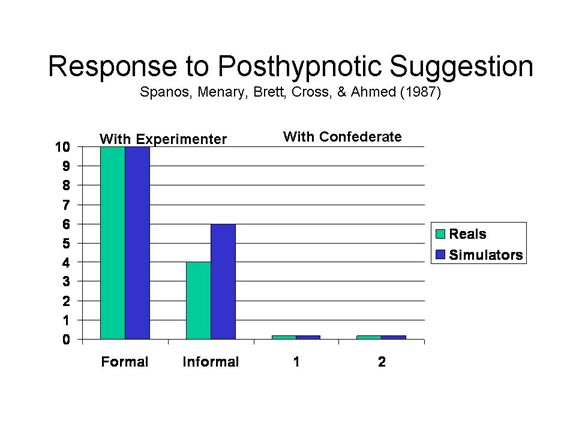 Spanos, N. P., Menary, E., Brett, P. J., Cross, W., & Ahmed, Q. (1987). Failure of posthypnotic responding to occur outside the experimental setting. Journal of Abnormal Psychology, 96, 52-57.