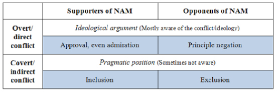 The two groups of overt conflict express a direct and pronounced argument for or against NAM, an explicit ideological position, and are mostly aware of the conflict. In contrast, the two secondary groups, of covert and indirect conflict, express a pragmatic position that is a practical realization of the ideology. They seemingly act on the basis of a given discourse (of exclusion or inclusion of NAM), without being aware of the existing conflict and the ideology latent in their choice. Their academic work reproduces the ideology, and thus take passive part in the conflict. Beyond these divisions, we wish to characterize the criteria and values that underlie the academic position, i.e., the arguments and reasons for opposition or support. This content addresses the researcher’s choice, and uncovers her predisposition. Thus, the following remarks relate to studies that contain a direct struggle, and which explicitly raise criteria as part of this conflict. In striving to endorse or nullify NAM, its researchers indicate different scientific evaluation criteria such as eclecticism or authenticity that are supposed to decide NAM’s quality and status. Since the criteria are value charged, it is significant to inspect them when analyzing the academic polemic. Some criteria are accepted by all researchers, while others are identified with a certain group. For instance, it is agreed that NAM is eclectic, except that some see eclecticism as a blessing while others expect a genre to be coherent. In the case of historical authenticity—the mere criterion indicates an opposition to NAM. Thus, the controversy over the music’s quality does not necessarily lie in disputed facts, but in the evaluation of those facts. We would suggest sorting the values and criteria into two groups, one of them expressing a modernist paradigm and the other expressing a postmodernist paradigm (Butler 2010; Jameson 1991; Lyotard 1984; Pericles 2007).14 While the opponents of NAM, who are the majority, write in a modernist style, its supporters use a postmodernist one. Both paradigms—modernist and postmodernist—are actually the framework within which the debate around NAM takes place. Each of the paradigms relates differently to musical tradition, to aesthetics, and to science. Each of them upholds different values and therefore raises different criteria for evaluation, while imputing varying importance to each of them. Needless to say, this dynamic—which actually determines the research’s conclusions as to NAM—occurs behind the scenes. It is not present in the text, and may even be derived from values of which the writers themselves are not aware. According to the modernist paradigm, a musical genre is perceived as coherent, distinct from other styles and possessing clear boundaries, and the quality of the music is measured by a clear hierarchy. Ideal music is perceived as high-quality and intellectual, therefore understandable by the elite, as opposed to inferior music consumed by the masses, and concurs with a scientific approach. Its presence is at the center of the listener’s attention, as opposed to ambience music, which is played in the background and is on the periphery of one’s attention.15 “High-quality” music is unique, and it does not try to imitate other musical works; its stylistic and cultural affiliation is clear, and there is clarity as concerns its composer. There is mutual feedback between appreciation for the producer of the music and for her products, with emphasis on the product, according to the quality with which the producer is esteemed. “Pure” music is a product of mere artistic expression, as opposed to functional music, which has underlying non-artistic intents. The postmodernist paradigm upholds different values than those noted above. Whereas the modernist seeks authenticity, the postmodernist denies the possibility of attaining it. In lieu of modernist research that tracks historical sources in the past, the postmodernist prefers to focus on the cultural context at present. Whereas the modernist would laud the stylistic coherence derived from defined boundaries, the postmodernist would praise the eclecticism of the sources and the stylistic diversity. Instead of the quality of the music, the postmodernist would seek its utility. Instead of focusing on composers and compositions or “depth” and “authenticity,” the postmodernist would focus on consumers and on the composition’s effect on them; “surface” and “death of the composer.” Instead of dealing with philosophical questions, the postmodernist prefers to focus on social and utilitarian (e.g. therapeutic) questions. Intellectualism is substituted, for the postmodernist, by an accent on emotion and experience. An interesting case that exemplifies the paradigm’s power is a negating research study (Summer 1996) that deals with music therapy. While one might expect a discussion on therapeutic utility (a typical postmodern criterion), in actuality the authors deal with questions of authenticity and scientific truth, which stem from their modernist paradigm. Even when opponents of NAM present its positive sides, these are also derived from judgment according to modernist criteria. For example, Prendergast, an opponent of NAM, who describes it as inferior in quality, gives it credit for advancing minimalist music of “genuine quality,” i.e., he attributes positive value to it in accordance with modernist criteria, which distinguish between qualities that are “genuine” and “false” (Prendergast 2000, 144). All in all, the opposition can be summed up as concentrated on the claim that NAM does not measure up to modernist criteria. It would serve the discussion to add the conceptualization that distinguishes between an etic and an emic discourse (Headland, Pike, and Harris 1990). In Anthropology, an etical discourse includes the scientific terminology and categories stemming from the researchers