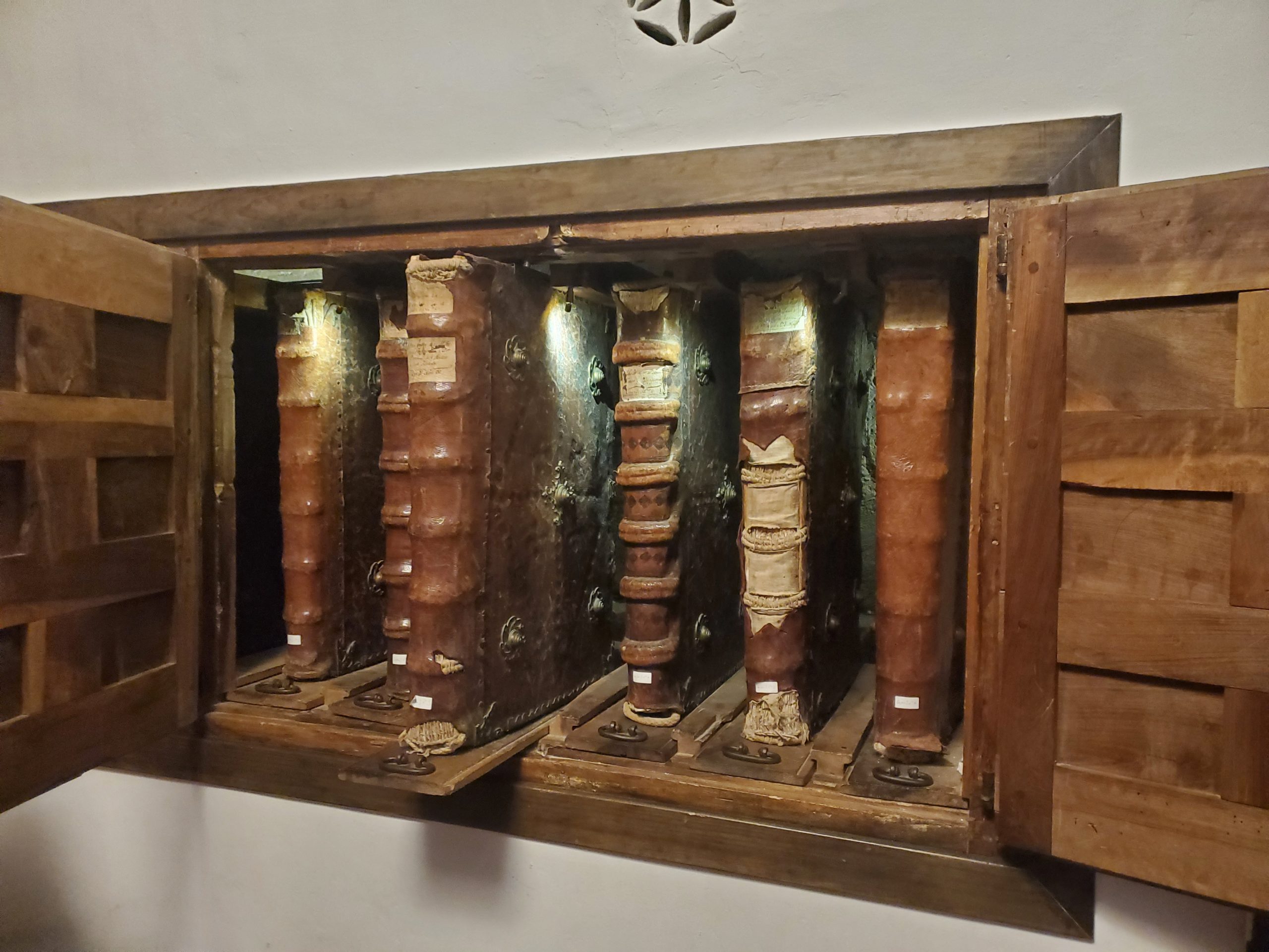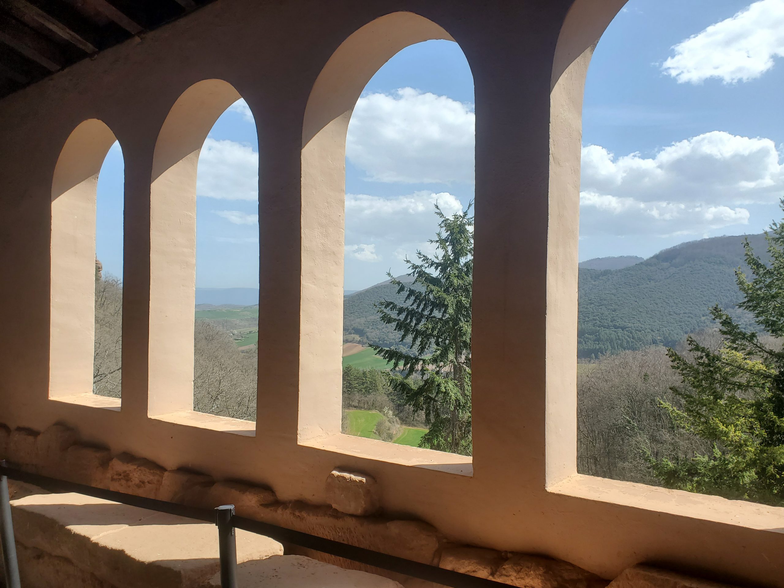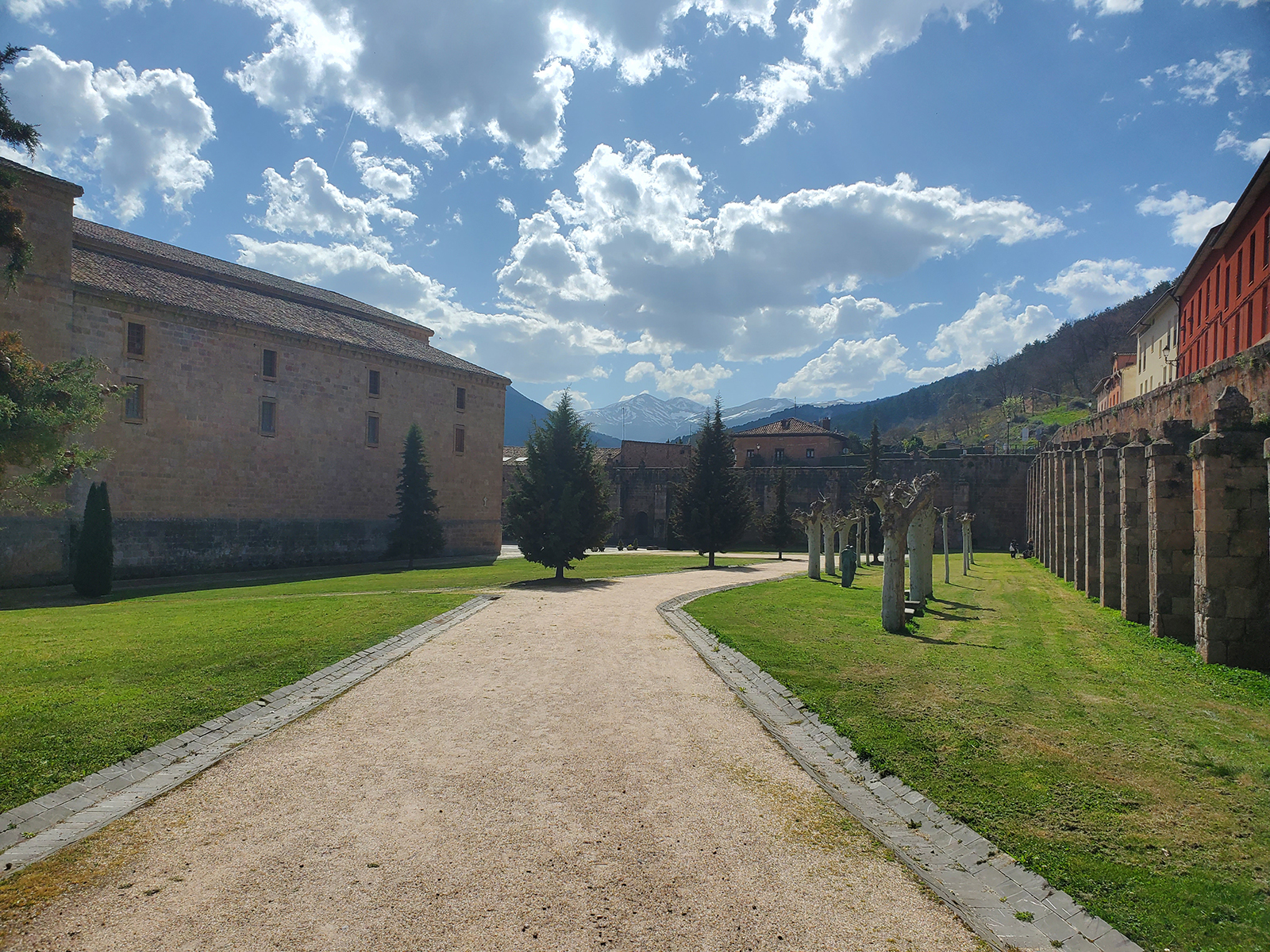 Yuso looks like the picture of a monastery. In March, the valley it sits in was lush with green, and San Lorenzo stood tall overhead, capped with snow. The monastery is an impressive stone building with an elaborate facade and tall entrance doors. We began our tour by passing through a walkway with a high gothic ceiling, looking out at the adjacent courtyard through the curves of a stone arcade. Our first stop was the monastery’s church. It was similar to many of the other beautiful churches I’ve visited in Spain, except for the massive painting of San Millán that hangs above the main altar. In the picture, Sán Millán is riding a unicorn into battle while wielding a sword of flame. After the church, we climbed the stairs to the second floor to see the canticles. These are huge books weighing about 70 kilograms each and made from the skin of many, many dead animals. Notated in enormous font on each of their pages are passages of gregorian chant to be sung by the monastery’s choir. The font is large so that, when the cantile is opened and placed in the choir, the singers at the back can see the text just as well as those in the front. The tour of Yuso ended shortly after seeing the canticles and we moved on to Suso.