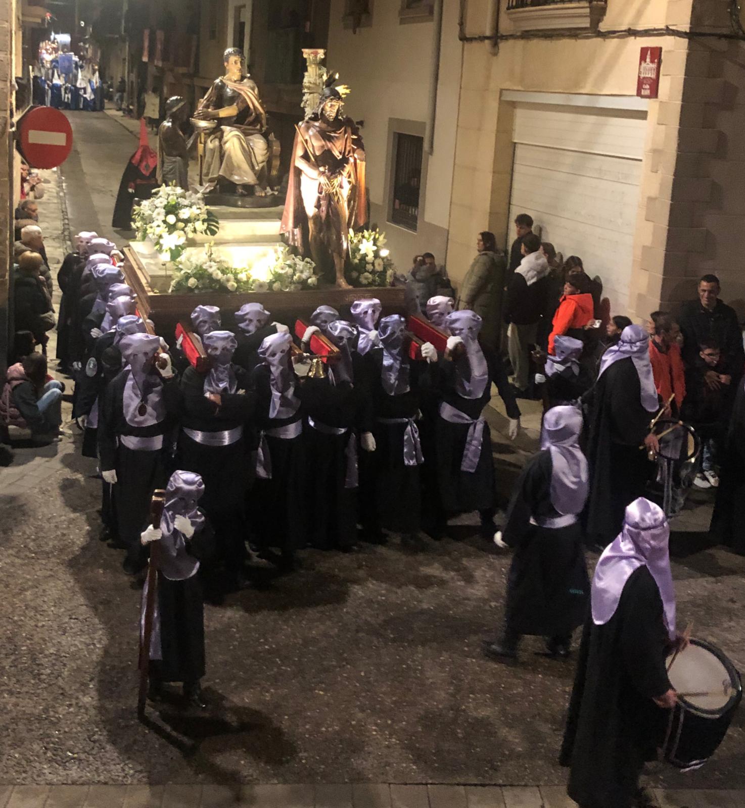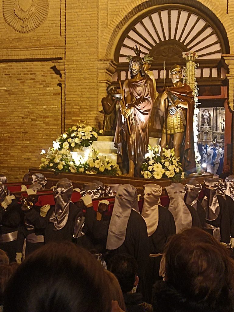 I learned I would be part of the paso “Pilatos,” though its official name was “La Sentencia,” or “The Sentence.” Our regalia was a purple hood, a black robe, a purple sash, and white gloves. Four figures appear in The Sentence: Jesus, a Roman soldier, a servant, and the emperor Pontius Pilate (hence the unofficial name “Pilatos”). In the scene, Pilate has just condemned Jesus to death and washes his hands in a bowl held by the servant. Jesus looks forward, his head illuminated with a halo, as he is led away by the Roman soldier. The morning of Good Friday was the first time I saw the paso. I had roped a language assistant friend into participating with me, and we met at the museum where the pasos are stored. We learned that we would be two of thirty-two trabadores, the name for those who carry the paso. We also learned that our paso was the second heaviest, weighing in at 685kg (≈1510lbs). I was assigned the front row, he was assigned the right side. We were given no safety briefing, waiver, or other instructions on carrying the paso; we were just told when to return that evening. Apparently it would be a “learn as you go” experience.