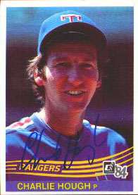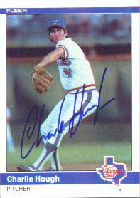 Autographed 1985 Fleer Card of Charlie Hough, showing Hough the Ranger on the mound