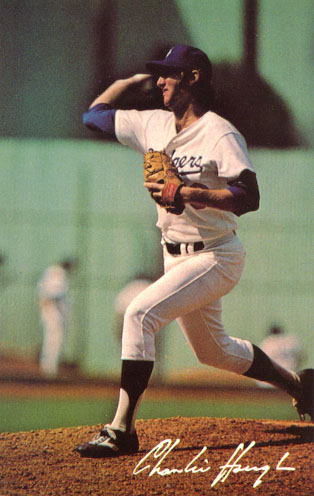 Charlie Hough pitches for the Dodgers early in his career. Picture shows him in LA's home uniform.